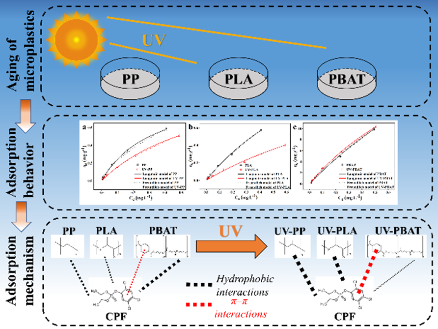 李成亮教授团队长期从事污染物环境行为相关的研究。在前期工作的基础上,该研究选择两种可生物降解的微塑料(PBAT和PLA)和一种不可降解的微塑料(PP)作为研究对象,探究紫外线老化1个月对微塑料表面改性及其对毒死蜱吸附行为的影响。结果表明:1)紫外线老化后微塑料比表面积降低,结晶度增加。2)紫外线老化降低了PLA微塑料和PP微塑料对毒死蜱的吸附能力,但提高了PBAT微塑料的吸附能力。3)影响毒死蜱在老化微塑料上吸附行为的因素是比表面积、疏水相互作用和π-π相互作用。这些发现有助于了解微塑料的环境行为,并为评估水中微塑料的生态风险提供了理论依据。