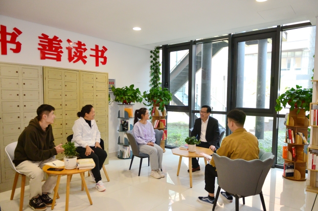 主题团日活动结束后,徐剑波来到经管学院“润心”读书角,十几个青年学生正在这里进行读书班读书分享会。