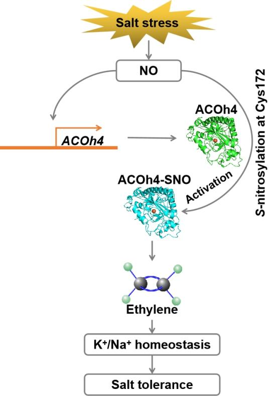 (4)盐碱诱导的NO可通过S-亚硝基化ACOh4的Cys-172来提高其酶活性,促进乙烯合成。