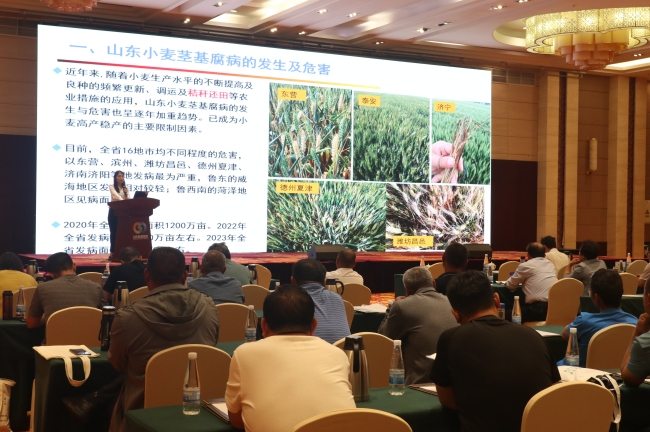 现场观摩中,植保学院教师、山东省小麦产业技术体系病虫害防控与质量控制岗位专家于金凤教授团队开展的小麦茎基腐病防控技术田间示范,防治效果显著,得到行业专家及现场观摩人员一致好评。团队骨干成员张莉博士做题为《山东小麦茎基腐病的发生及综合防治策略》的技术培训,展示了农业措施与化学防控相结合的“两控一晚+一拌一喷”的小麦茎基腐病关键防控技术方案,详细讲述了控制播种深度和播种量、适期晚播为核心的农业措施,以及种子包衣和返青期用药为关键的化学措施。
