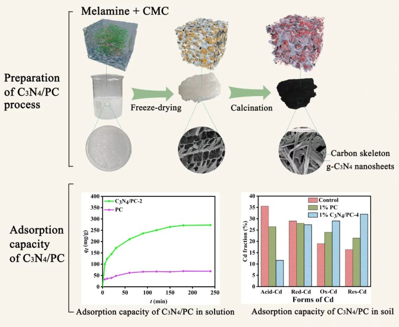 镉是土壤中最常见的高毒性重金属污染物。C3N4纳米片具有优异的重金属去除潜能,但由于C3N4纳米片的团聚导致其比表面积大幅减少,在Cd污染土壤中应用难度较大。本研究以羧甲基纤维素与三聚氰胺不同质量比的混合气凝胶为原料,通过简单的一步煅烧法制备了一系列C3N4纳米片改性多孔炭。基于羧甲基纤维素气凝胶的限域合成效应,气凝胶的三维区域控制了C3N4的形态并阻止了纳米片的聚集,复合材料呈现为纳米C3N4片与碳棒互穿的多孔结构。与未改性的多孔炭相比,改性后对Cd离子的吸附量提高了3.97倍,达到273.1 mg/g。吸附动力学和等温线分析表明,吸附符合准二级吸附模型和Freundlich吸附模型。该材料对土壤中的Cd离子具有良好的钝化作用,为土壤重金属治理提供了新的思路和策略。