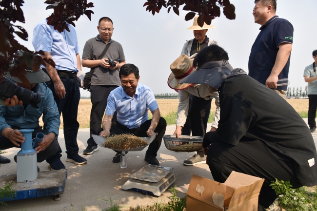 烈日炎炎中,土地丈量、收获脱粒、称重、水分测定、取样测定杂质率等一系列环节结束,专家们给出测产数据:“亩产774.1公斤!”孙维山颇为满意,李建国更是兴奋。作为拥有几千亩地的种植大户,一斤小麦多卖几毛钱收益极为可观。“今年秋季要多种‘山农48’,抱住这个‘金疙瘩’。”他告诉记者。