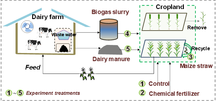 合适的农业废弃物管理模式对缓解气候变化、确保粮食安全至关重要。“作物秸秆-畜禽-粪便-农田”是一种很有前景的碳管理模式。在该模式中,畜禽养殖系统可将作物秸秆作为畜禽饲料,既减少了“人畜争粮”的矛盾,也减少对大豆或草等高碳足迹饲料的依赖;作物系统可循环利用来自这些农田副产物的畜禽粪便,从而减少由化肥使用而造成的温室气体排放。然而,我国当前农牧分离较为严重,不同农业废弃物管理模式对碳固存的影响尚不清楚。因此,亟需寻找一种最佳的农业废弃物管理模式促进农业生产和缓解气候变化。