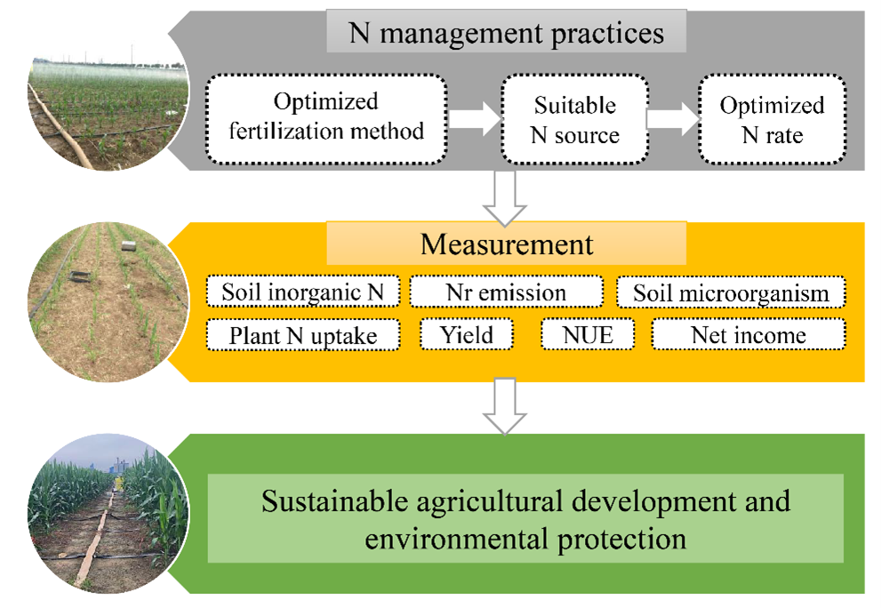如何提高作物氮肥利用效率,减少氮肥损失对环境的污染,已引起人们的高度关注。该团队通过设置不同施氮方式、氮肥类型和施氮量处理,研究水肥一体化施用尿素硝酸铵溶液(UAN)对气态氮排放、氮肥利用效率以及微生物宏基因组等相关反应的综合影响(图1)。
