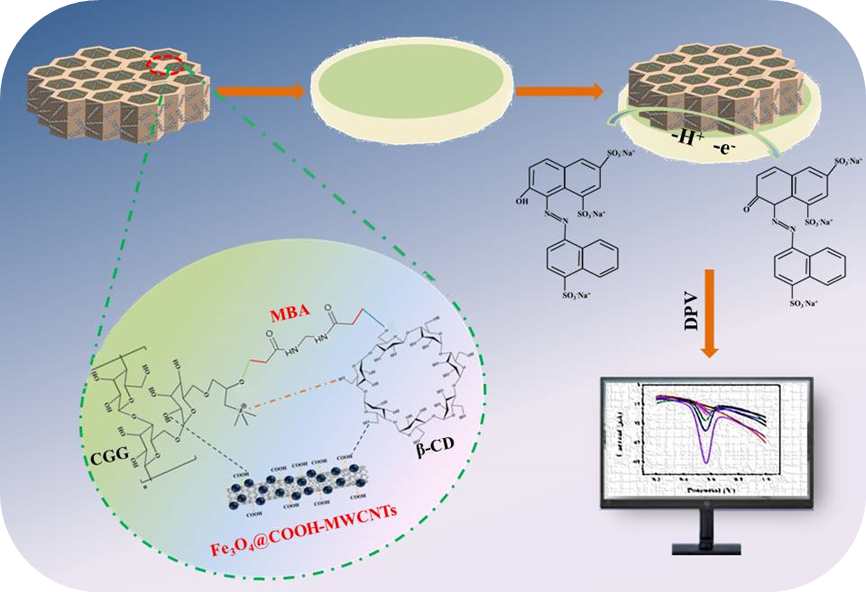 基于此,研究团队采用一锅低温磁搅拌法制备了双网络磁性导电水凝胶(MCHG),研发了一种高灵敏度、高重复性的MCHG基电化学传感器,用于食品中胭脂红的检测。Fe3O4@COOH-MWCNTs作为交联剂不仅增强了MCHG水凝胶的均匀性,同时也提高了对胭脂红的平衡吸附容量、电导率和电催化性能。此外,MCHG/GCE传感器对胭脂红的检测具有较宽的线性范围、低的检出限和良好的实际应用性(饼干和糖果)。这项工作表明,多功能水凝胶作为信号放大剂在食品中目标化合物的电化学检测中具有广阔的应用前景。