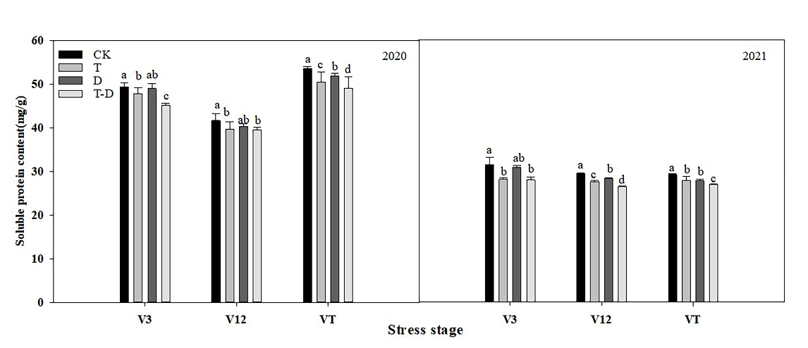 图2 不同生育时期高温、干旱及其复合胁迫对夏玉米可溶性蛋白的影响