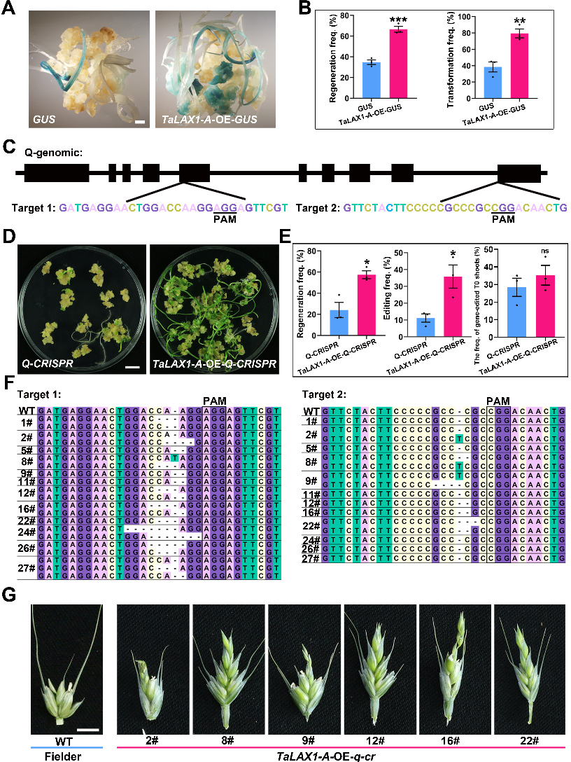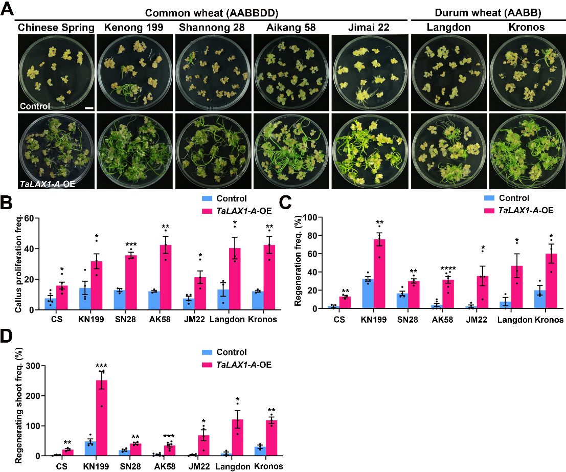图2. 过量表达TaLAX1提高遗传转化和基因编辑效率