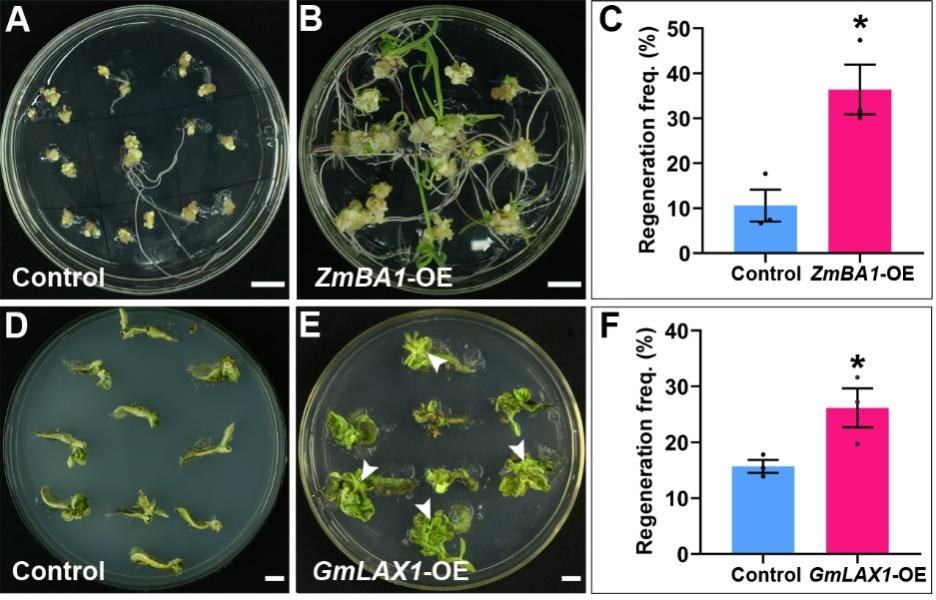 作者发现在玉米和大豆中过量表达TaLAX1的同源基因,存在保守的提高再生能力的效果(图3)。