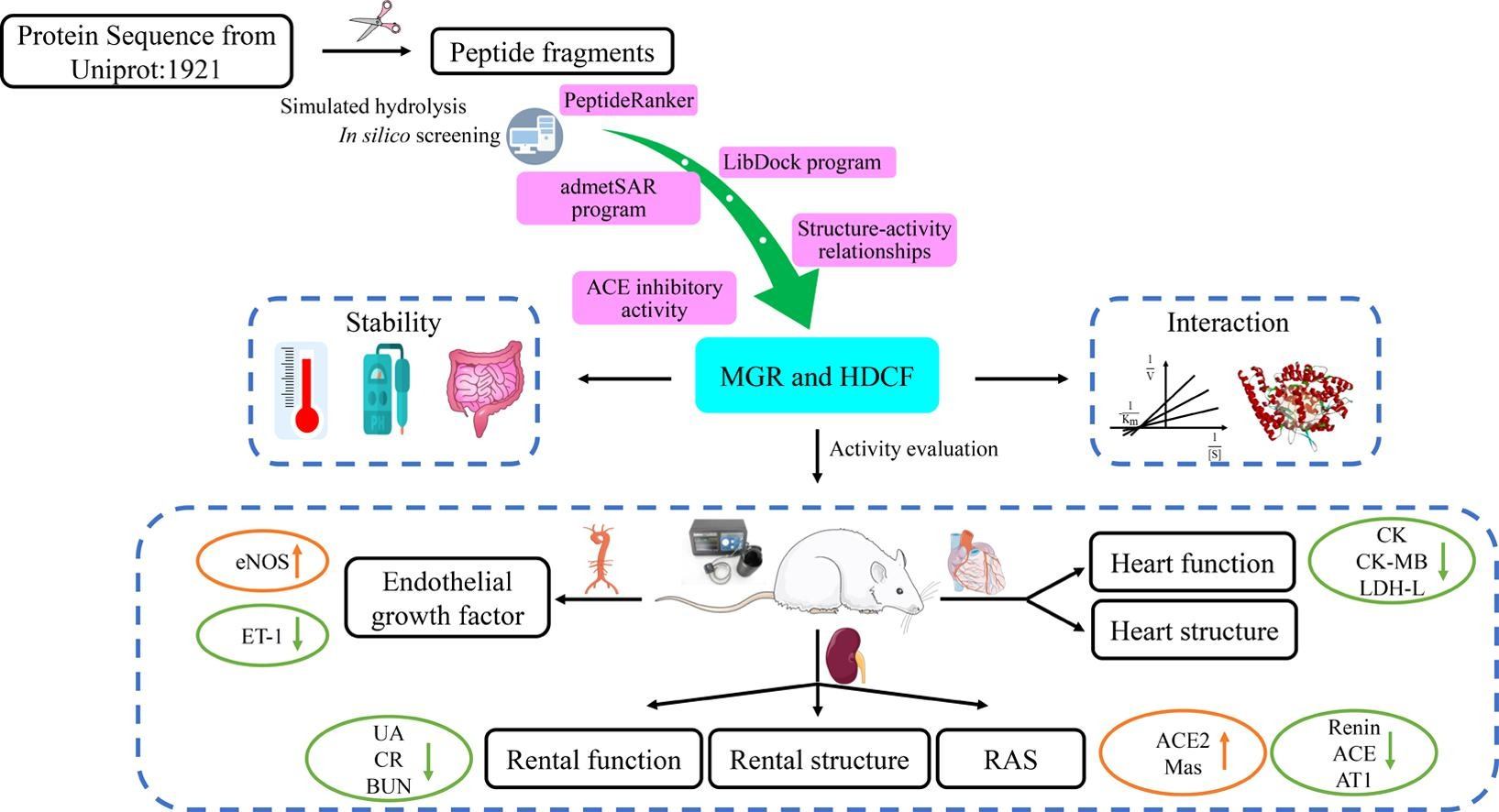 传统的分离纯化方式能够有效的鉴定出ACE抑制肽,但操作周期较长,实验成本较高,近年来新兴的计算机技术在一定程度上能够解决这些问题。本文采用计算机模拟方式鉴定大蒜ACE抑制肽,借助胃蛋白酶、胰蛋白酶和胰凝乳蛋白酶模拟切割Uniprot数据库中的大蒜蛋白,依次通过PeptideRanker、LibDock、ADMET和构效关系进行筛选,最终结合ACE抑制活性确定了MGR和HDCF为新型高活性的ACE抑制肽。通过自发性高血压大鼠研究其体内对血压的调控作用,发现目标组分可有效降低自发性高血压大鼠的收缩压和舒张压,主要途径为通过平衡肾素-血管紧张素系统,改善肾脏、心脏结构和功能损伤以及调节内皮功能障碍发挥降压活性。
