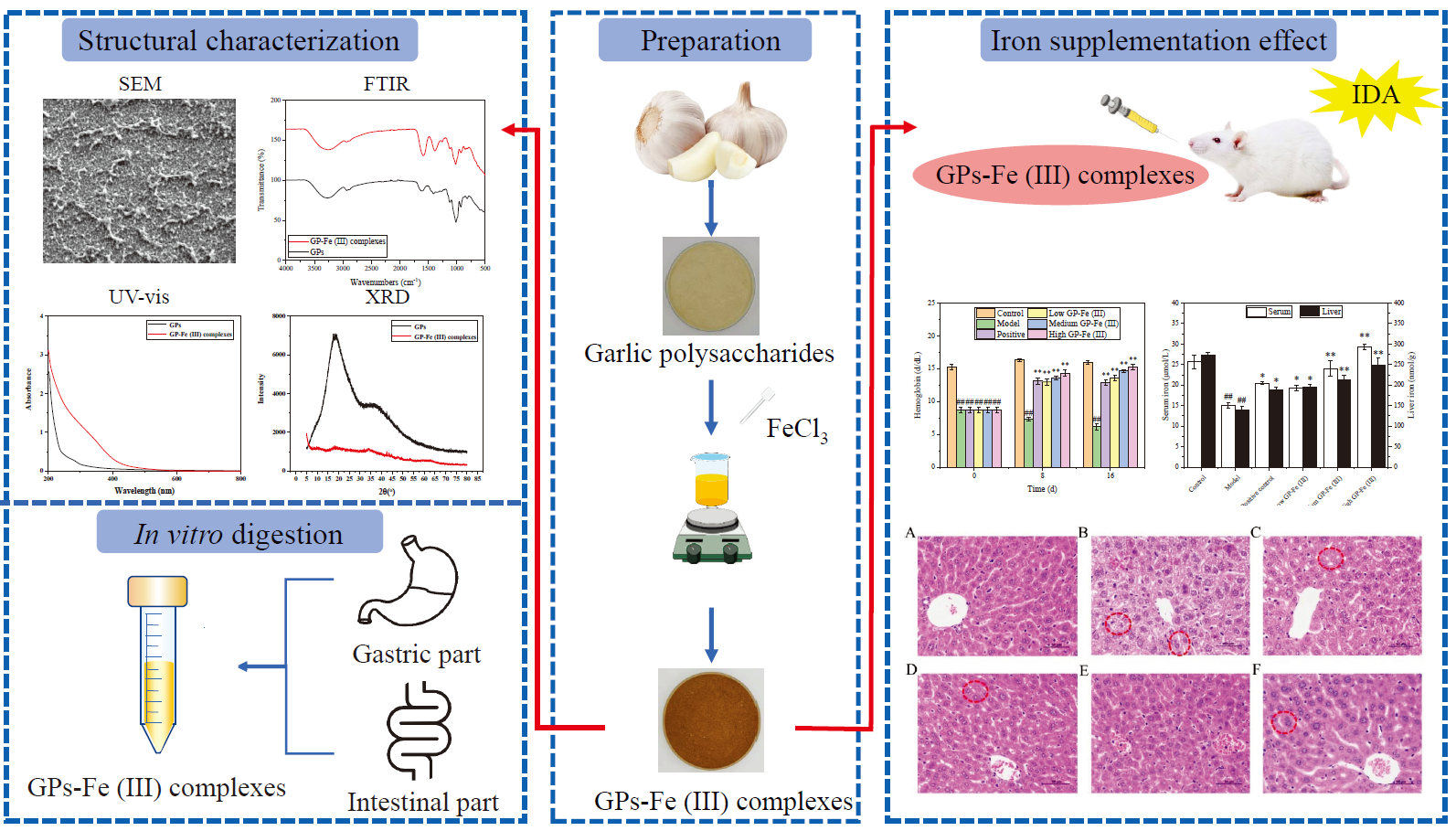 近日,米乐mile体育官网食品科学与工程学院乔旭光教授研究团队在Food Chemistry发表了题为“Developing garlic polysaccharide-Fe (III) complexes using garlic pomace to provide enhanced iron-supplementing activity in vivo”的论文,系统研究了大蒜多糖-铁复合物的制备、表征、体外消化以及体内补铁活性,该结果对大蒜加工副产品的高价值利用至关重要,为补铁保健品和辅助治疗药物的开发和应用提供参考。博士研究生齐永秋和邱志常博士为共同第一作者,乔旭光教授和郑振佳副教授为本文的共同通讯作者,米乐mile体育官网为论文唯一完成单位。