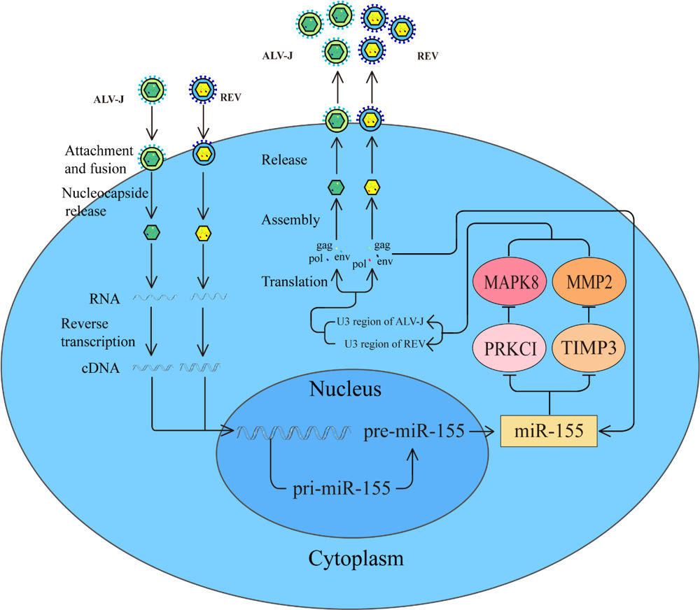 论文揭示了禽白血病病毒J亚群与禽网状内皮组织增殖病病毒协同促进了一种关键的miRNA(miR-155)的表达,这种miRNA能够直接调控PRCKI-MAPK8和TIMP3-MMP2双通路,通过影响两种病毒复制的关键区域(LTR区)促进禽白血病病毒J亚群与禽网状内皮组织增殖病病毒协同复制。