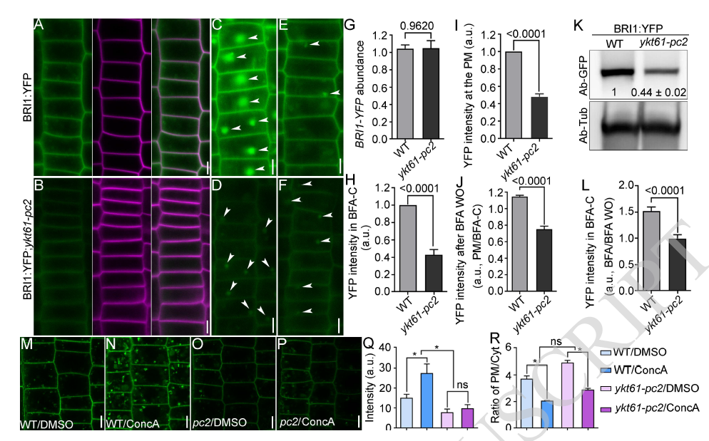 拟南芥YKT61是一种非典型的R-SNARE蛋白,不包含其他R-SNAREs所具有的跨膜(TM)结构域,因此它主要存在于细胞质。该团队之前研究发现,YKT61的功能缺失导致雌/雄配子体致死(Ma et al., 2021)。本研究通过利用YKT61的弱突变材料-ykt61部分回补(ykt61-pc)株系,发现敲降YKT61导致因细胞分裂减少而造成的RAM长度变短,这与bri1-116突变体类似。YKT61与BRI1互作,对于BRI1靶向质膜的动态再循环至关重要。进一步分析表明,YKT61对液泡的动态生物发生、高尔基体形态的维持和内吞作用均十分重要,这也暗示它可能是一个植物整体生长和发育必须的基因。