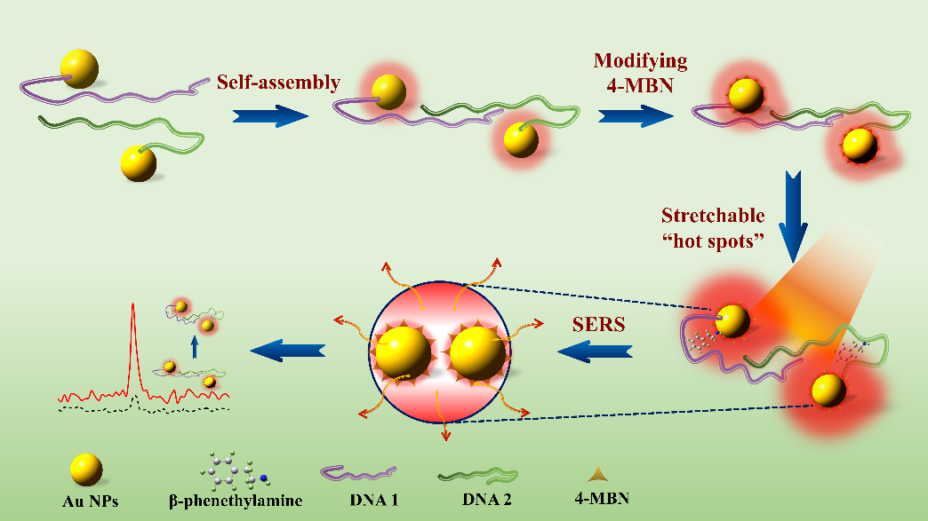 图1. 适配体构象介导金二聚体自组装用于β-苯乙胺的SERS检测示意图