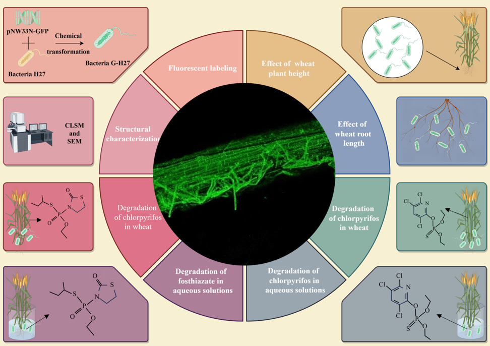 残留在农业环境中的有机磷农药对农作物质量、人类健康和生态环境具有一定风险,如何消减环境中的有机磷农药并阻止其向农作物迁移具有重要意义。目前,微生物修复是最具发展和应用前景的生物修复技术,微生物可通过形成生物膜增强其生物功能,强化污染修复效果。本研究通过构建荧光标记蜡样芽孢杆菌G-H27(Bacillus cereus),基于荧光标记菌G-H27的生物膜建立了毒死蜱和噻唑膦高效降解体系,探究了该菌通过定殖和成膜对小麦根表毒死蜱和磷噻嗪的去除效果。