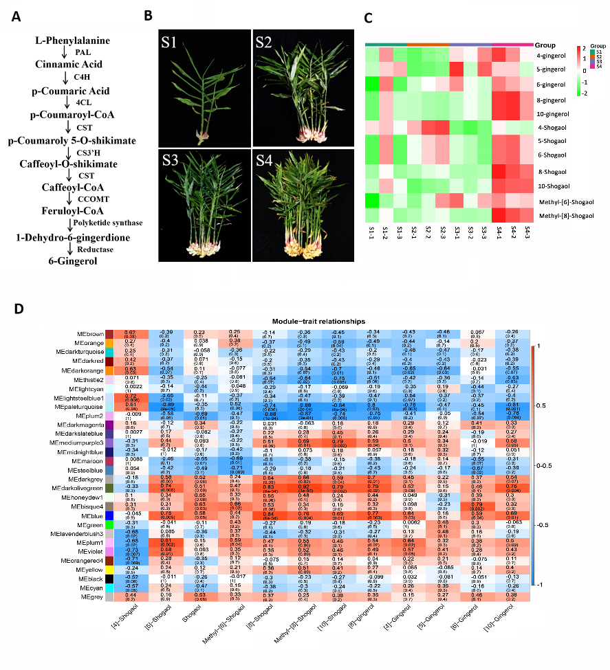 对‘莱芜小姜’四个发育期的根茎进行了转录组和代谢组联合分析,发现了6-姜酚的合成通路,解析了“姜还是老的辣”的机理。