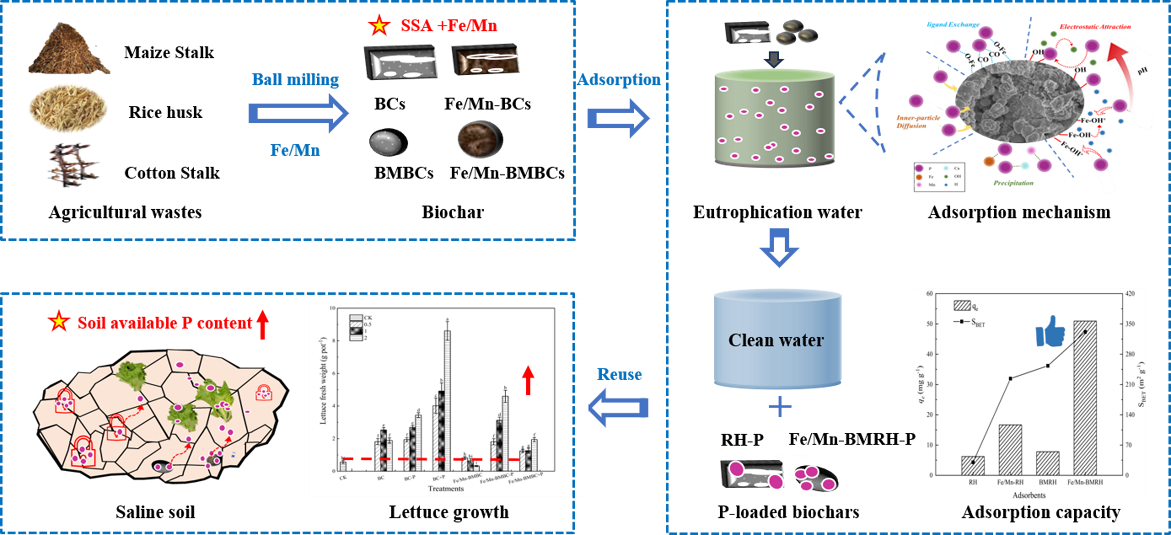 该研究选择四种农业废弃物(两种棉花秸秆、玉米秸秆和稻壳)制备生物炭,联合采用球磨处理与金属改性方法,制备了铁锰改性球磨生物炭,比表面积比原始生物炭提高近8.27-15.1倍、比铁锰改性生物炭提高41.9%。铁锰改性球磨生物炭对磷酸盐的吸附量是原始生物炭的4.47-5.82倍。吸附磷酸盐的生物炭应用于盐渍土壤提供磷素补充,提高盐渍土壤磷素含量促进生菜的生长。本研究结果为富营养化水体中过量的磷素应用于盐渍土壤开辟了新途径,为提升盐碱土壤肥力提供了新思路。生物炭的应用推动农业废弃物的资源化利用,为我国生态环境可持续发展具有重要作用。
