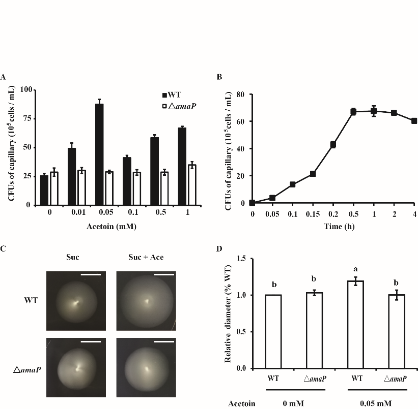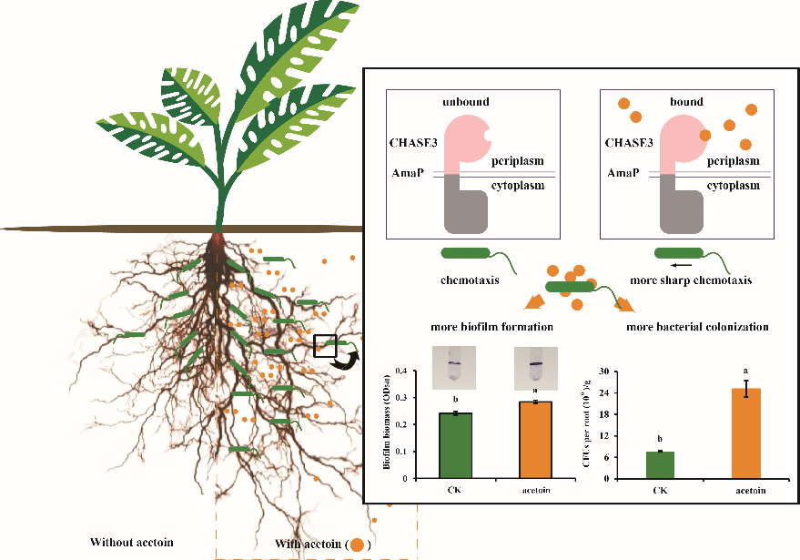 挥发性有机化合物(VOC)是一类由土壤细菌产生的低分子量亲脂性气态化合物,能够在土壤环境中快速扩散。已知微生物VOC在提高植物抗逆性、促植物生长、改善细菌适应性和调控土壤微生物组成等方面具有重要作用。此外,根际挥发性的分子还在其中介导植物与相关微生物之间的信号传导。乙偶姻(3-羟基丁-2-丁酮),可以被大多数微生物产生,是主要VOC之一。迄今对微生物VOC的研究工作多局限于种类鉴定,对植物的促生功能;然而,微生物VOC对根际促生菌的生理变化和与其宿主植物的共生有关的机制仍不清楚。