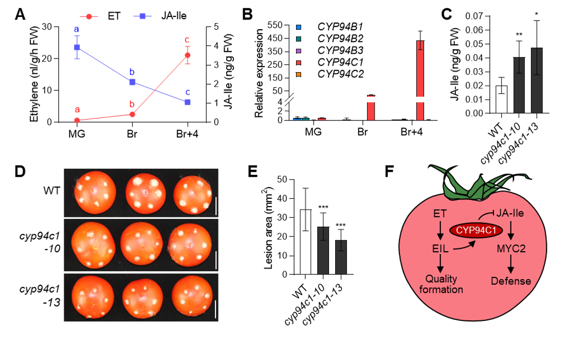 在拟南芥中,Cytochrome P450 94 (CYP94)家族的成员通过ω-氧化使JA-Ile失活。其中,AtCYP94B1和AtCYP94B3将活性形式的JA-Ile转化为低活性的12-OH-JA-Ile,而AtCYP94C1则可以进一步将12-OH-JA-Ile转化为无活性的12-COOH-JA-Ile。拟南芥的这三个基因均受机械损伤诱导表达。序列分析结果发现,番茄基因组一共编码3个CYP94B氧化酶(CYP94B1、CYP94B2和CYP94B3)和2个CYP94C氧化酶(CYP94C1和CYP94C2)。有趣的是,与其他成员不同,CYP94C1的表达受成熟强烈诱导,而不受机械损伤诱导。体外酶活试验表明CYP94C1可以将JA-Ile转化为无活性的12-COOH-JA-Ile。而敲除CYP94C1可显著提高成熟果实中的JA-Ile含量,进而提高果实对死体营养型病原菌的抗性。上述结果表明,CYP94C1在果实成熟过程中被特异诱导表达,从而使JA-Ile失活,进而消减茉莉酸介导的抗性反应。