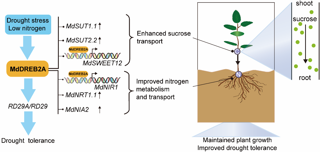 AP2/ERF转录因子DREB2A在维持植物生长、响应干旱胁迫中起着关键作用,但这一过程的分子机制仍有待阐明。本研究中发现,MdDREB2A通过与MdNIR1启动子结合,促进氮素在根系的积累,抑制其向地上部的转运,从而正向调节氮利用。此外,MdDREB2A还可以直接与MdSWEET12的启动子结合,促进干旱条件下的蔗糖转运,从而促进根系发育和氮素同化,最终促进植物生长。总之,这一调控机制为植物在干旱胁迫下协调抗旱性和氮素同化以维持植物的最佳生长发育提供了思路。