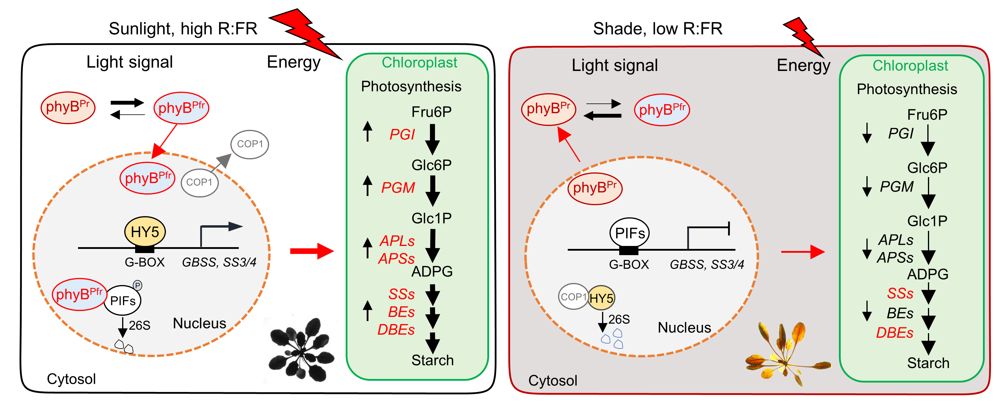 淀粉是植物主要的碳水化合物储藏形式,对植物的代谢、生长和发育至关重要。植物体内淀粉主要分为两种类型:暂时性淀粉和储藏淀粉。暂时性淀粉主要在叶片中合成和积累,在白天光照后开始合成,并在夜间迅速降解,以响应昼夜光暗周期的变化,为植物提供必要的能量和碳骨架。储藏淀粉则在非光合作用的储藏器官中合成和积累,作为长期能量储备,支持植物的休眠、种子发芽或在光合作用不足以满足植物能量需求时的生长。瞬时淀粉的合成和降解是一系列复杂的细胞过程,涉及多种酶和调控因子的协调作用。例如,ADP-葡萄糖焦磷酸化酶(AGPase)启动淀粉合成的第一步,而颗粒结合型淀粉合酶(GBSS)和可溶性淀粉合成酶(SS1、SS2、SS3、SS4)则负责淀粉分子链的延长。淀粉合成的调控受到代谢、昼夜节律、光照和温度的影响。其中,光照不仅为光合作用提供能量进而提供了淀粉代谢的最初底物,还直接控制各种基因的表达和细胞过程。尽管光照对淀粉合成的影响已有大量研究,但关于光信号如何具体影响淀粉合成,尤其是在环境光照条件变化下的影响,仍需进一步研究。