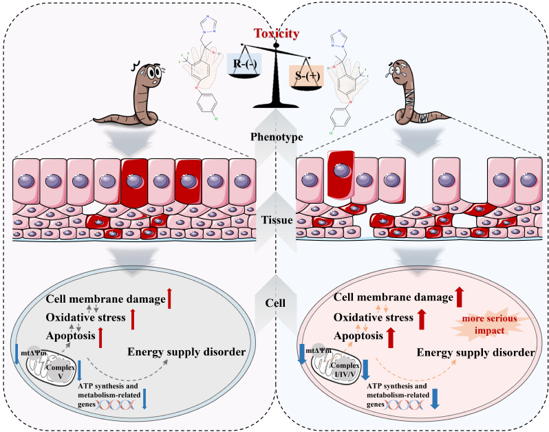 课题组以土壤为主要汇的新型手性农药氯氟醚菌唑为研究对象,通过整合多生命层次传统毒性终点和转录组学,探究了氯氟醚菌唑对映体对土壤模式生物赤子爱胜蚓的毒性效应及分子机制。研究结果表明氯氟醚菌唑对映体对蚯蚓的亚慢性毒性具有立体选择性,而线粒体功能障碍的差异是这种选择性的关键。具体表现为:与R-(-)构型相比,S-(+)构型特异性上调线粒体细胞组分,并鉴定出更严重的线粒体裂变;此外,S-(+)异构体更显著的下调ATP合成和代谢相关生物过程,特异性抑制线粒体呼吸电子传递链复合物I和IV的活性,导致更严重的电子流紊乱。这种供能障碍的差异最终介导了立体选择性个体发育过程受阻。本研究可为氯氟醚菌唑有害结局通路的构建提供系统的支持数据,也为手性农药环境毒理学机制的研究提供参考方法。在指导氯氟醚菌唑高效和安全利用角度,虽然R-(-)构型对蚯蚓具有更高的安全性,但推荐使用R-(-)单体应基于对更广泛物种的风险评估和对生态风险降低所带来效益的总体评估。