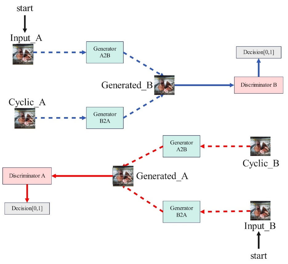 因此,本研究提出了一种笼养蛋鸡头部特征增强检测模型(CCMNN模型)。该模型基于大数据和深度学习循环一致迁移神经网络进行笼门去除。如图1所示,设计的核心是通过两个生成器和两个判别器构成的对抗网络进行训练。生成器分别用于源域中的图像转换和目标域中的图像转换;判别器分别用于生成的图像和真实图像的判别。对抗性损失通过最小化生成图像和真实图像之间的差异来训练生成器和判别器。