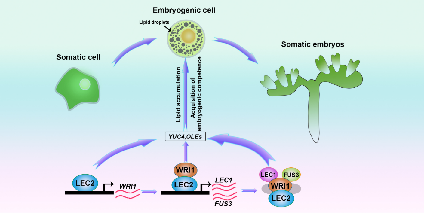 该研究发现调控油脂合成的关键转录因子WRI1功能缺失导致细胞内油脂积累大幅减少,体细胞胚的诱导受到抑制。研究还发现WRI1与LEC2之间存在相互作用且WRI1能够加强LEC2对下游靶基因LEC1和FUSCA3(FUS3)的激活作用,促进体细胞胚向胚性细胞的转变。进一步研究发现,WRI1与LEC1、LEC2和FUS3存在蛋白互作且能够形成复合体增强对生长素合成相关基因YUCCA4(YUC4)和油脂合成相关基因OLE3的激活,促进体细胞胚胎诱导过程中生长素和油脂的积累,从而更有利于体细胞胚的诱导形成。