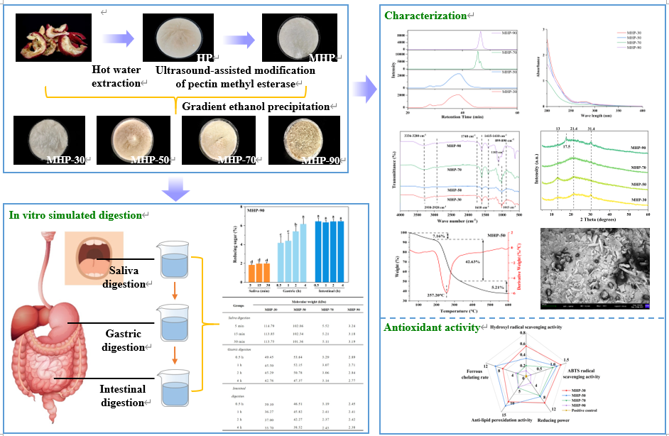 近日,食品科学与工程学院朱传合教授团队在《International Journal of Biological Macromolecules》发表了题为“Characterization, antioxidant activity and in vitro digestion of hawthorn pectin prepared by gradient ethanol precipitation”的研究论文。朱传合教授、张晓燕副教授为共同通讯作者,研究生朱毅伟为论文的第一作者。