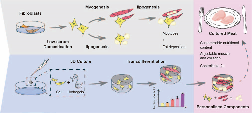 近日,国际学术期刊eLife发表了动物科技学院王恒教授团队关于细胞转分化的研究论文,“Transdifferentiation of fibroblasts into muscle cells to constitute cultured meat with tunable intramuscular fat deposition”,通过重编程鸡和猪的成纤维细胞,高效生成肌肉、脂肪和胶原,制备能够精准调控肌内脂肪含量的人工培育肉产品。