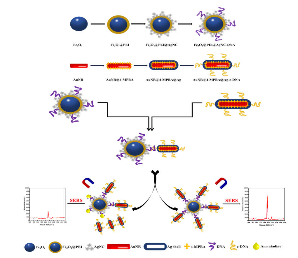 基于此,研究团队基于Fe3O4@PEI@AgNC-apt为捕获探针,AuNRs@4-MPBA@Ag-c-DNA为报告探针,研发了一种超灵敏、高选择性的新型SERS适体传感器,用于食品中金刚烷胺的检测。捕获探针的超顺磁性、报告探针的间接拉曼信号以及适配体的特异性使得SERS适体传感器方法提供了较宽的线性浓度范围以及低的检出限。这项工作表明,构建的新型SERS适体传感器可以实现低含量金刚烷胺的检测,并通过改变构建传感器的适配体和互补DNA链的类型来实现对其他小分子的检测。