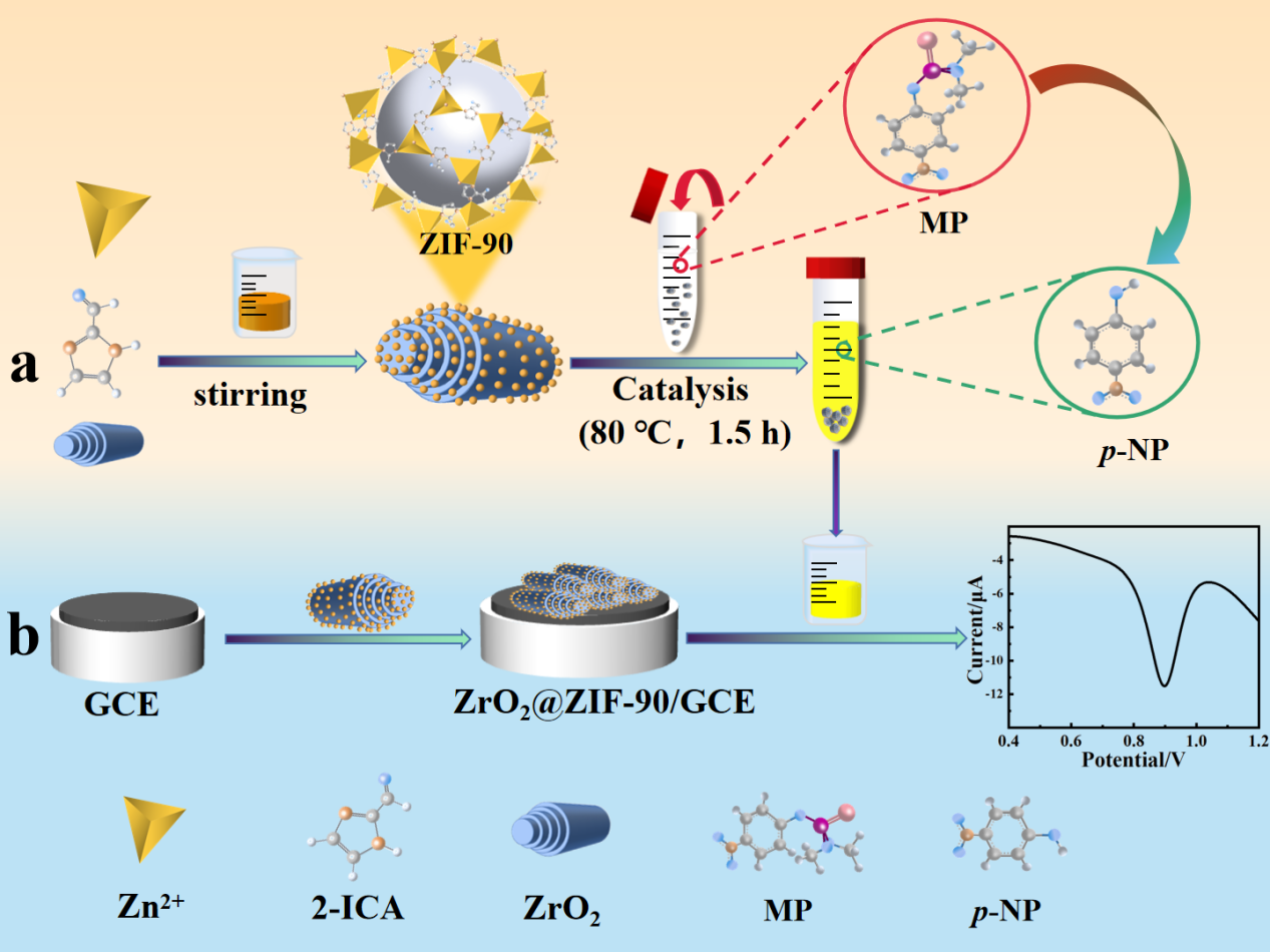 基于此,团队研究合成了一种双功能ZrO2@ZIF-90纳米酶,用于甲基对硫磷的催化降解和电化学检测。ZrO2@ZIF-90纳米酶高效的磷酸水解酶活性可以有效地降解MP生成对硝基苯酚,同时其还具有良好电催化和信号放大性能。建立的ZrO2@ZIF-90传感器对甲基对硫磷的检测具有较宽的线性范围、良好的抗干扰性和准确性。这项工作表明,双功能纳米酶在食品危害物的电化学检测中具有广阔的应用前景。