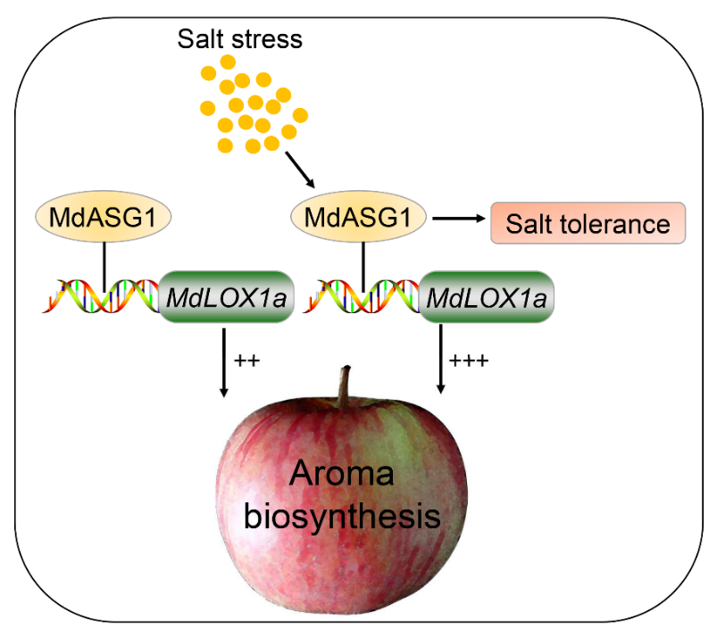 综上所述,MdASG1通过激活MdLOX1a的表达,参与脂氧合酶途径,同时MdASG1响应盐胁迫进一步促进果实挥发性香气物质合成。这一发现首次明确盐碱响应因子对果实香气合成的分子调控机制,对未来利用盐碱地生产并提高果实品质提供理论依据。