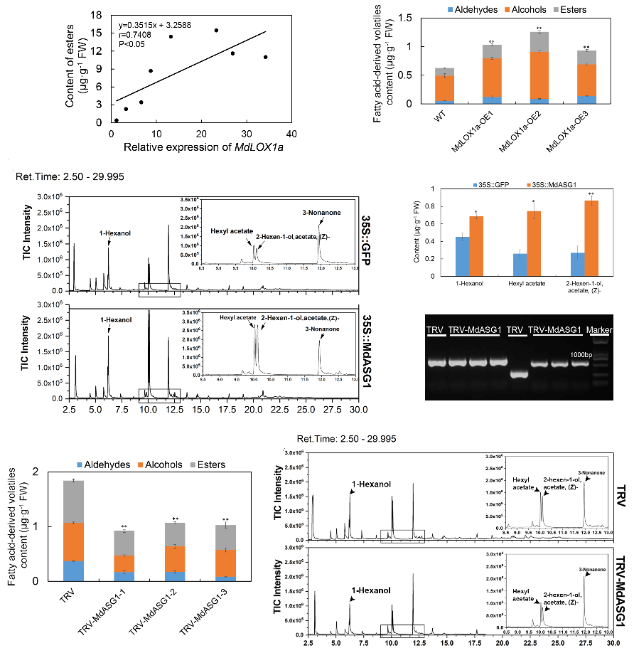 本研究通过线性回归分析和转基因验证,发现脂氧合酶MdLOX1a与果实酯类化合物合成密切相关。通过酵母单杂筛选,鉴定一种称为MdASG1(ABIOTIC STRESS GENE 1)的蛋白,它作为正调控因子促进MdLOX1a的表达及酯类化合物的合成,并通过遗传转化及GC-MS分析验证以上结果。