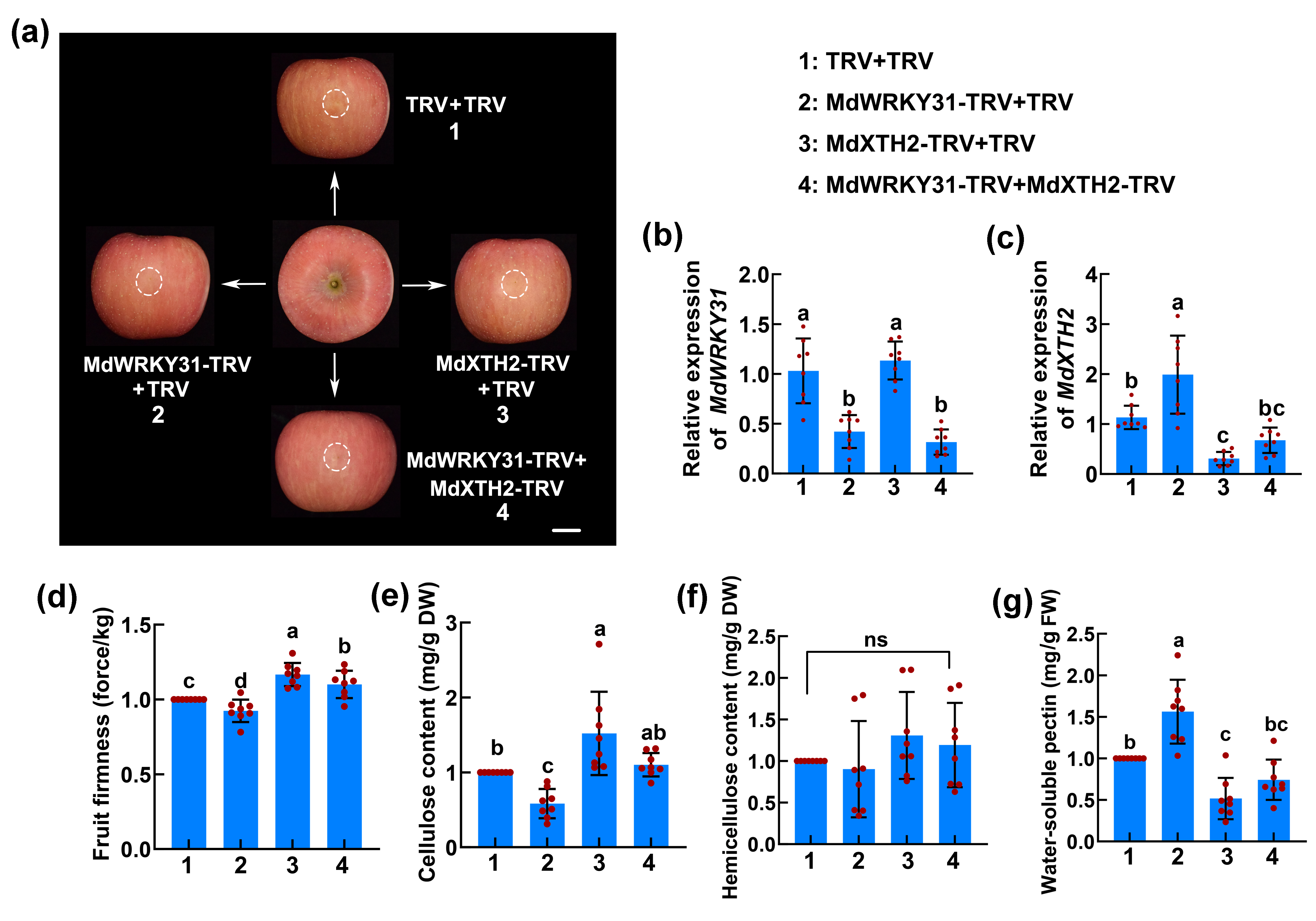 软化受一系列初生细胞壁修饰相关酶及编码基因调控,包括多聚半乳糖醛酸酶(PG)、果胶裂解酶(PL)、木葡聚糖内糖基转移酶(XTH)、扩张蛋白(EXP)等。研究人员基于团队前期已获得的苹果转基因植株,发现超量表达MdWRKY31可以引起苹果植株细胞壁组分的变化,结合转录组测定和分子生化实验分析,筛选到靶基因木葡聚糖内糖基转移酶基因MdXTH2。通过苹果果实瞬时表达实验明确,MdWRKY31通过转录抑制MdXTH2表达维持果实硬度。