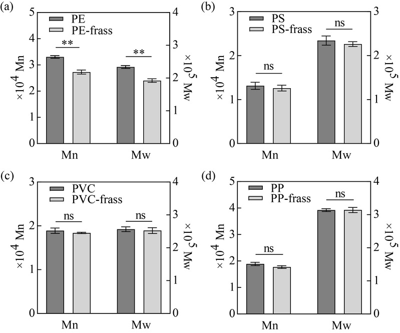 图2. GPC分析发现,与PE、PS、PVC 和PP 相比,虫粪中残留聚合物的分子量(Mn 和Mw)发生了变化。