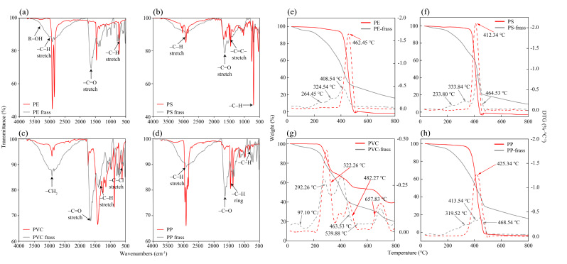 图1. 喂食塑料后大麦虫粪便与初始塑料的傅立叶变换红外光谱及热重分析图谱。