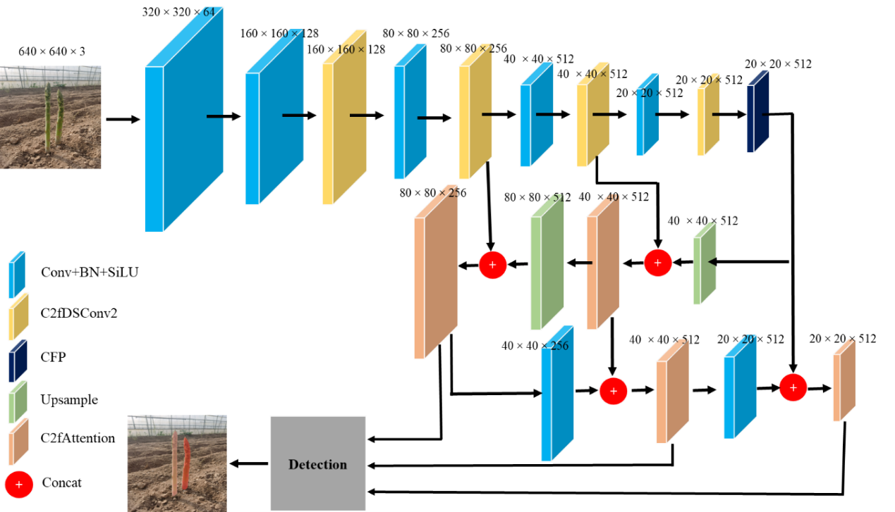 针对以上技术难题,米乐mile体育官网苑进教授团队以大田种植的绿芦笋为研究对象,首创了S2CPL绿芦笋选择性采收过程中采收适宜性评价和土下切割点精确定位的关键方法。该方法利用RGB-D传感器获取绿芦笋的图像和空间深度信息,对YOLOv8的实例分割算法进行了研究和改进提高分割精度,同时提出了一种利用图像掩模融合深度信息计算绿芦笋长度和直径的三维形态提取方法,最终实现了机器人选择性采收的收获评价和图下三维切割点定位。该项研究还建立了一种为机械化采收末端执行器提供目标点信息的相机位姿优化方法。该技术有望为提高绿芦笋选择性采收中的视觉定位系统提供重要核心技术,实现成熟绿芦笋自动化、智能化采收,促进绿芦笋产业的发展。