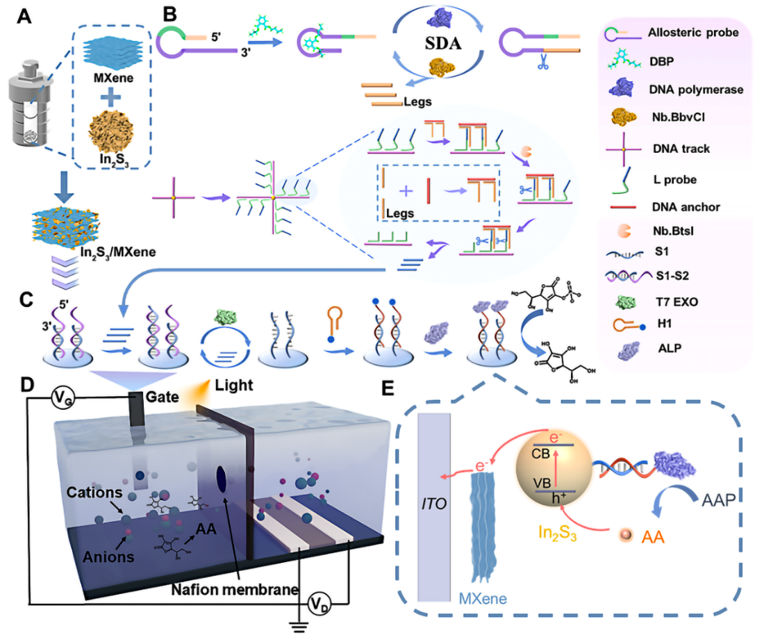 近日,化学与材料科学学院殷焕顺教授团队周云雷副教授在《Advanced Functional Materials》上发表了题为“In2S3/MXene-Gated Organic Photoelectrochemical Transistor with Target-Induced Dipedal DNA WalkerModulation for DBP Biosensing”的研究论文。硕士研究生张浩伟为该论文的第一作者,周云雷副教授和殷焕顺教授为该文的通讯作者,米乐官网为唯一通讯单位。
