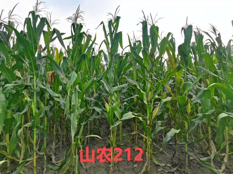 玉米品种山农212,由刘保申教授主持选育。株型半紧凑,春播生育期118天,比对照山农206早熟2天,全株叶片21片,幼苗叶鞘浅紫色,花丝粉红色,花药黄色略带紫,雄穗分枝10个。株高261厘米,穗位110厘米,倒伏率0.1%、倒折率1.0%。果穗筒形,穗长15.8厘米,穗粗5.1厘米,秃顶0.5厘米,穗行数16~18行,穗粒数578粒,白轴,半马齿型、黄粒,出籽率87.7%,千粒重320.0克,容重755.2克/升。