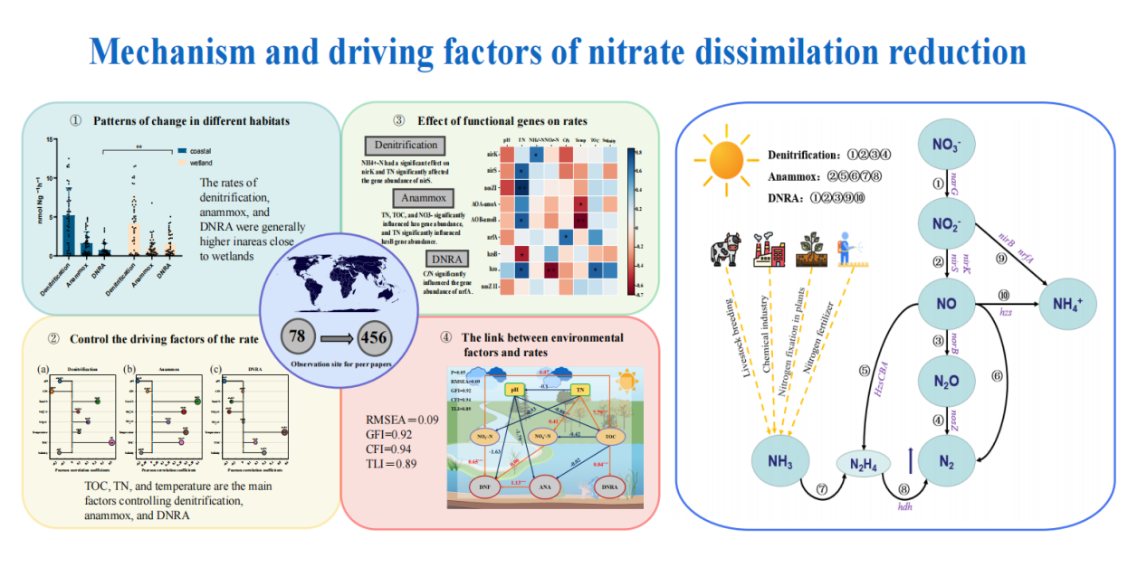 目前由于工农业造成的外源氮素大量输入,在海洋、河口湿地等地区已经出现赤潮爆发等系列环境问题。反硝化、厌氧氨氧化和DNRA过程是全球生态系统重要的氮素转化过程,然而在海洋湿地生态系统中三类典型氮转化速率的空间分布格局和控制因素还尚不清楚。研究首次基于全球546个观察站点的三种氮素转化速率进行Meta分析,旨在量化水域生态系统中反硝化、厌氧氨氧化和DNRA的速率并探讨环境因素对三种过程的驱动机理。研究结果表明,土壤理化因子、气候带以及季节对氮循环相关过程的影响非常显著,靠近湿地区域的反硝化、厌氧氨氧化和DNRA速率普遍高于海洋区域。另外,氮循环功能基因丰度变化也对其对应的氮转化速率也有着间接影响。本研究强调了氮素相关的理化指标及气候特征对氮循环过程有着深远的影响,这为全球气候变化下的环境治理提供了重要的科学参考。
