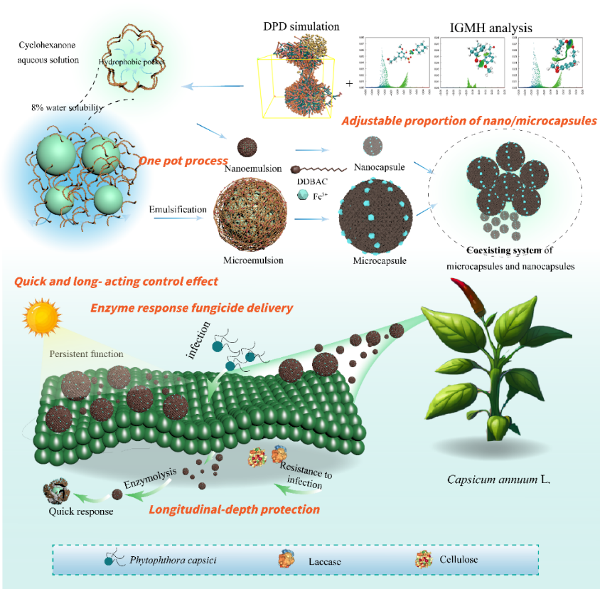 该研究以静电力为驱动力,木质素磺酸盐和烷基季铵盐为成囊原料,开发出一种一锅法能够实现微/纳米囊兼存的农药负载体系。结合实验表征以及IGMH分析和分子耗散动力学模拟阐明了纳米囊和微囊的形成机理,其中,微囊(2-3 μm)由木质素磺酸盐和烷基季铵盐在药剂和分散介质形成的油水界面上静电吸引而成,木质素磺酸盐与溶剂环己酮之间的弱相互作用驱动生成的纳米胶束,提供了纳米级模板,形成纳米囊(160-220 nm)。田间应用时,以木质素磺酸盐为囊壳组分的载药微粒与致病菌侵染植物互作过程中产生的漆酶和纤维素酶具有响应特性,导致负载活性成分加速释放,微、纳米颗粒在叶面内外各司其职,实现了对辣椒疫霉病快速且持续的控制。