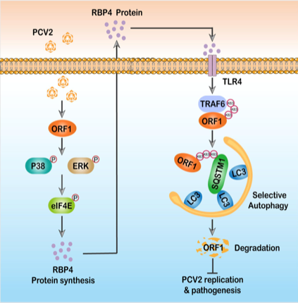 在本研究中,研究人员发现PCV2感染宿主细胞后能够活化MAPK-eIF4E信号通路从而诱导RBP4蛋白水平显著升高,RBP4升高后能够显著抑制PCV2的复制,而RBP4缺失后促进病毒复制。RBP4做为一种分泌型细胞因子,在胞内合成后能够分泌至胞外,以反馈的方式抑制PCV2的复制。深入研究表明,RBP4通过激活自噬受体SQSTM1/p62介导的PCV2病毒蛋白ORF1的选择性自噬降解,进而抑制PCV2的复制。进一步研究发现,RBP4通过活化TLR4信号通路活化下游的E3泛素连接酶TRAF6,从而触发SQSTM1/p62介导的选择性自噬,促进K63介导的病毒复制相关蛋白ORF1的泛素化降解。该研究结果证实RBP4是一个PCV2的关键宿主限制因子,揭示了宿主细胞防御PCV2感染的新机制。该项研究为深入理解PCV2的发病机制以及新型抗病毒药物研发提供了重要理论依据。