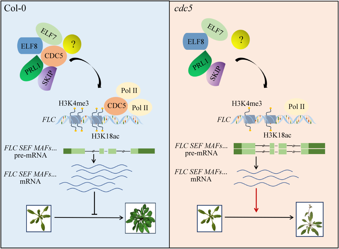 开花是植物从营养生长向生殖生长过渡的关键指标,植物在恰当的时间开花是确保繁殖成功的基础。植物的开花由复杂的调控网络精准调控,因此,解析植物开花过程中的分子调控机制对于深入理解开花调控过程具有重要意义。该研究发现CDC5突变体在长日照及短日照条件下均比野生型早花,关键开花抑制因子FLC及其同源基因MAFs的表达在突变体中显著降低。进一步分析发现,CDC5结合FLC染色质并且影响了RNA聚合酶II (Pol II)在FLC染色质上的富集。随后,通过IP-MS及蛋白互作验证发现CDC5与PAF1复合体的核心成员SKIP、ELF7和ELF8在体内互作,参与调控核心基因的剪接和组蛋白修饰过程。RNA-seq的结果及分子生物学证据显示CDC5介导了包括FLC、SEF和MAFs在内的许多关键开花相关基因的剪接。在染色质水平上,CDC5调控FLC染色质H3K4me3和H3K18ac的积累水平进而对FLC的表达进行调控。综上所述,该研究工作阐明了CDC5调控拟南芥开花的分子机制(图1),为植物开花调控的研究提供新的见解。