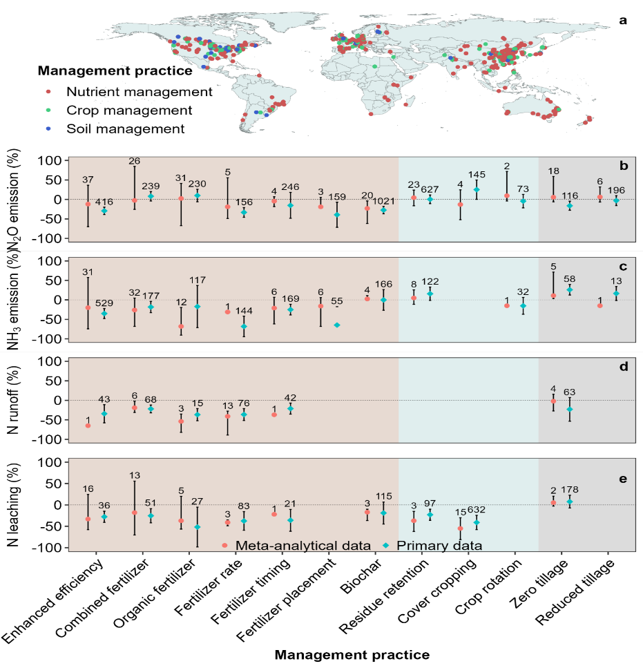 氮素是全球农业生产系统的关键养分,但其过量输入引发了一系列重大环境问题,已成为影响全球生态环境与可持续发展的核心挑战之一。过量氮损失不仅加剧了温室气体的积累、加重了空气污染,还导致水体富营养化,威胁生物多样性与人类健康。解决这一问题对于推动全球气候治理、提升环境质量和实现可持续发展目标至关重要,迫切需要农业采取科学的养分管理策略,实现高效、环保的氮素利用。采用可持续的养分、作物和土壤管理措施可有效减少氮损失。例如,优化氮肥类型、施用量、施用时机和位置的“4R”养分管理原则,结合秸秆还田、覆盖作物等措施,有助于提高氮利用效率、改善土壤健康并减少环境负面影响。同时,保护性耕作和生物炭施用在保持土壤结构和减少养分流失方面也有显著效果。当前相关研究主要关注单一农业管理措施对氮损失的影响,但缺乏对多种管理措施在不同场地条件下对氮损失影响的综合评估。土壤类型、气候条件等场地因素会影响氮素去向,量化这些因素对管理措施的影响十分重要。此外,当前的全球氮损失评估方法中,尚未充分考虑到不同地区已采用的改良措施。