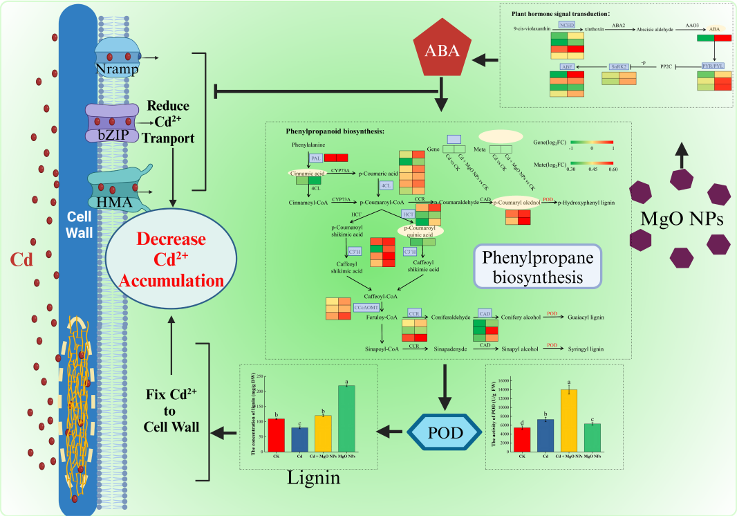 本研究通过使用氧化镁纳米材料(MgO NPs)来减少水培条件下镉对烟苗的损害并深入解析其中的机制。研究发现,MgO NPs可有效减轻镉对烟草幼苗的危害,主要通过减少镉吸收和调节镉分布来实现。深入研究发现一个关键因素:MgO NPs促进ABA的合成起核心调控作用。ABA通过两种不同的机制,不仅减少了镉的吸收,而且促进了细胞内镉在非活性成分(细胞壁)中的储存。首先,ABA下调NRAMP、bZIP、HMA等镉吸收相关基因的表达,从而降低镉吸收。其次,ABA激活了苯丙烷生物合成途径,促进了细胞壁主要成分木质素的合成。木质素含有可以固定镉的功能化学基团,使其固定在细胞壁上。这减少了镉在细胞膜和细胞器中的分布。