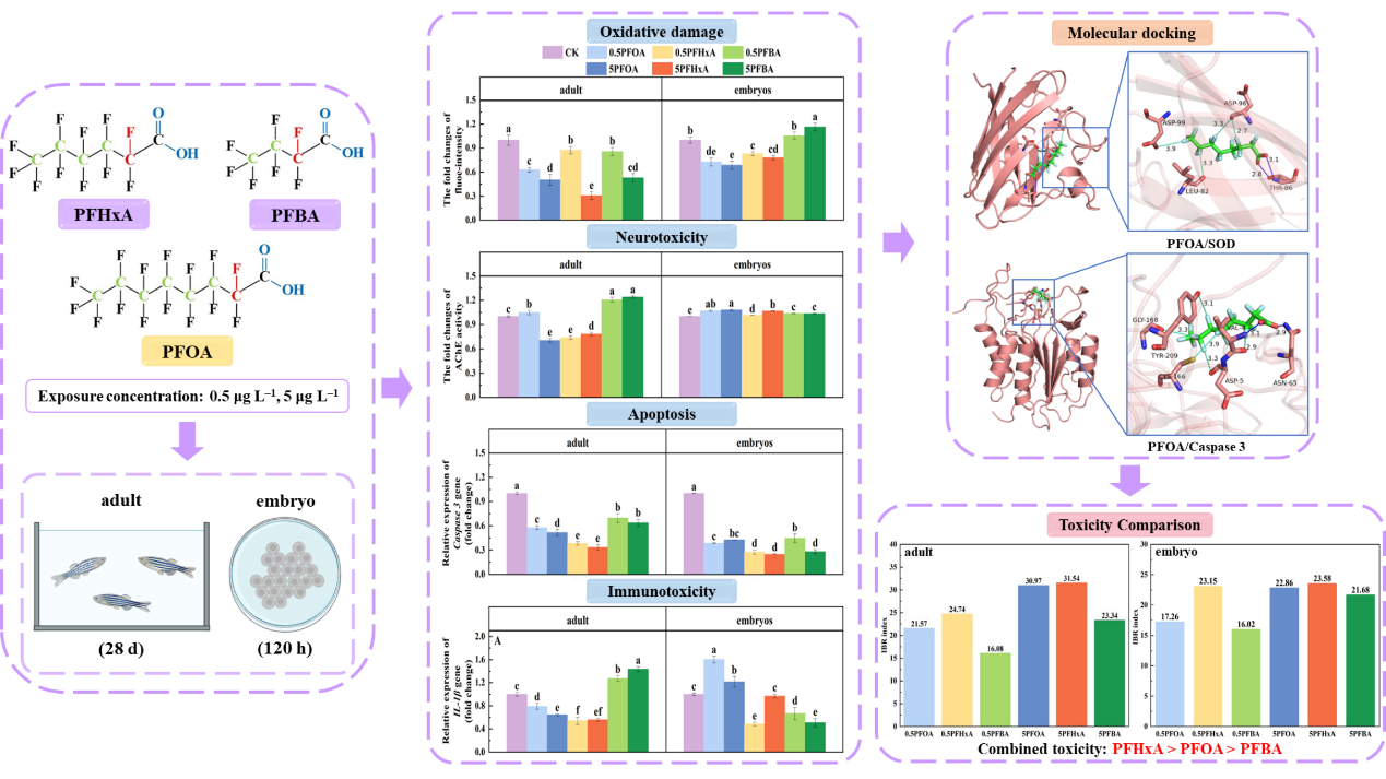 研究结果表明,在斑马鱼成鱼和胚胎体内,PFHxA、PFBA和PFOA会破坏氧化还原平衡,刺激细胞增殖,并可能具有神经毒性和免疫毒性。PFHxA和PFOA在诱导神经毒性和免疫毒性方面的毒性作用机制较为相似。分子对接显示,替代品和PFOA均可与蛋白质稳定结合,并改变蛋白质结构进而影响蛋白功能及活性。综合生物标志物响应指数结果表明,PFHxA、PFBA和PFOA对斑马鱼的毒性具有剂量效应关系;与PFOA相比,替代品PFHxA对斑马鱼的毒性更大。