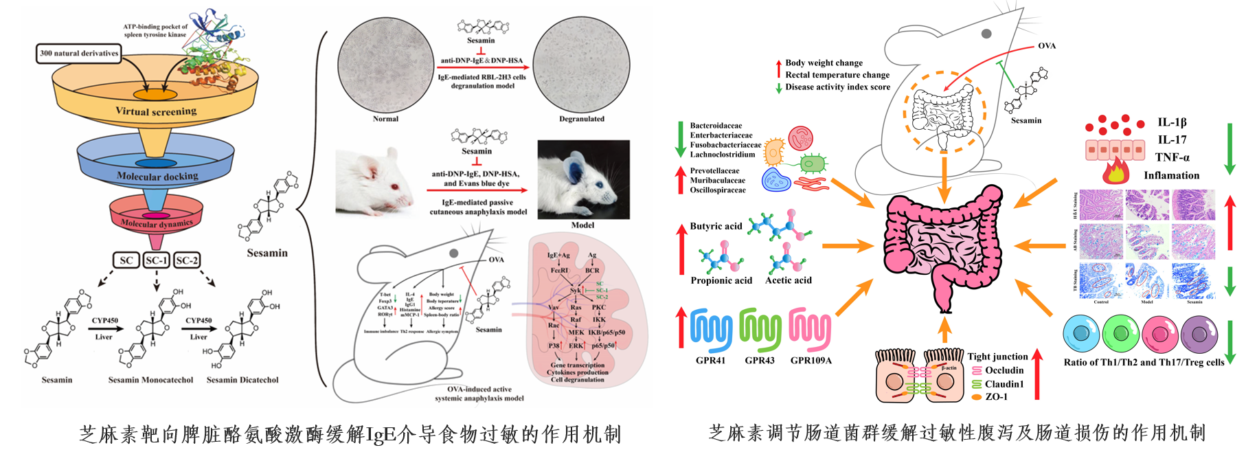 脾脏酪氨酸激酶是调控食物过敏发展的关键靶点。研究团队通过计算化学方法进行筛选,发现芝麻素及其代谢物具有作为脾脏酪氨酸激酶抑制剂的潜力。进而结合细胞脱颗粒模型、小鼠速发型过敏模型和小鼠食物过敏模型,探究了芝麻素的抗过敏作用机制。结果表明,芝麻素通过抑制脾脏酪氨酸激酶及其下游信号通路(如p38、ERK和p65)的磷酸化激活,显著缓解了IgE介导的肥大细胞脱颗粒效应和食物过敏反应。