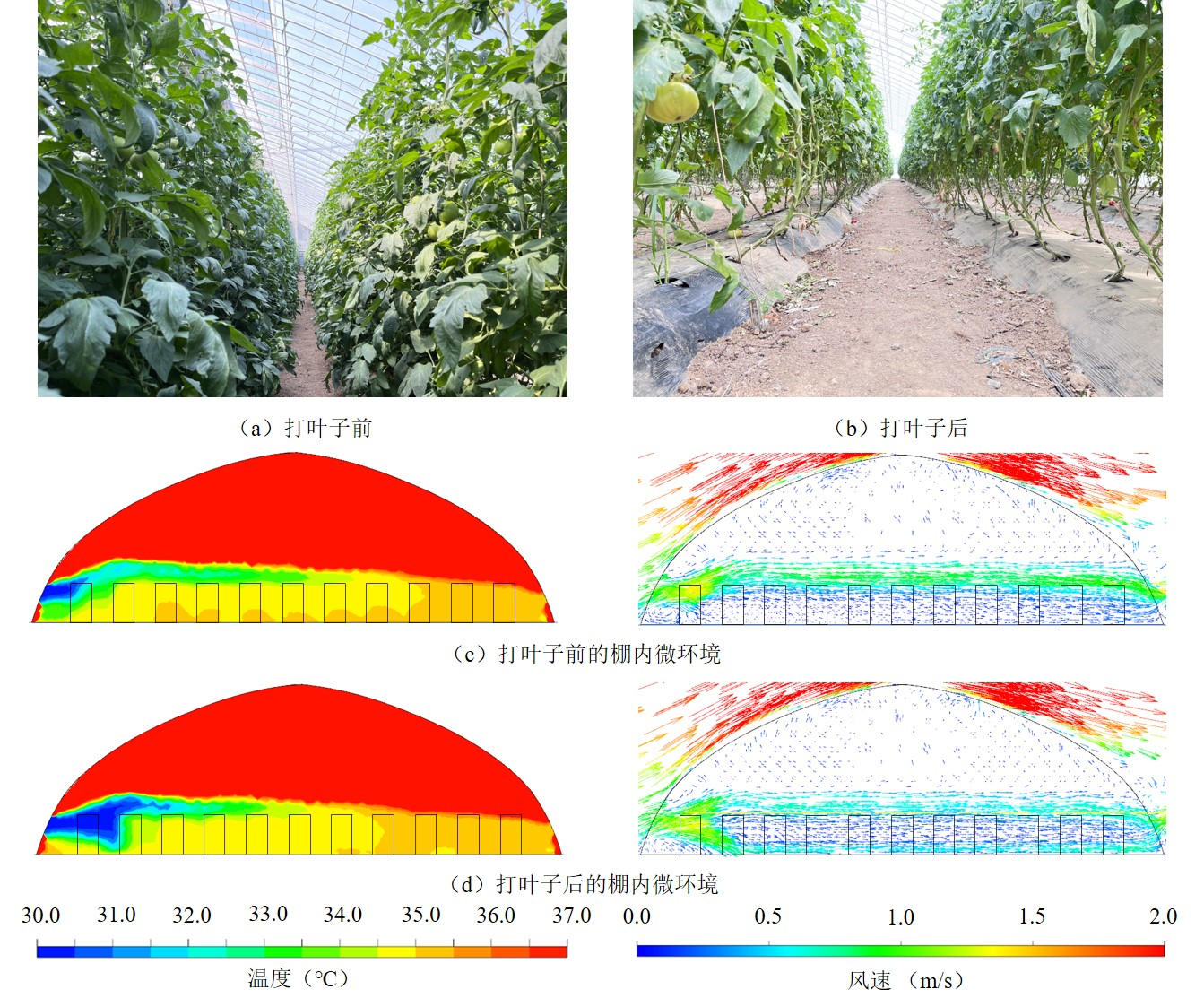 本文还以真实大跨度拱棚为背景,融合设施结构与番茄植株的气动特性开展了多场耦合仿真分析和现场测试验证。研究表明,设施番茄对气流的阻碍作用十分明显,尤其是对作物生长区的通风降温影响显著,气流同时受到作物的阻碍作用和两侧通风口的压迫效应。以农业生产为背景,验证了打叶子对改善棚内通风降温、提高作物品质的有益作用,气流由单通道流动转变为双通道流动,且原有高温区得到缓解,揭示了农艺管理措施“打叶子”对改善棚内微气候的作用机制。