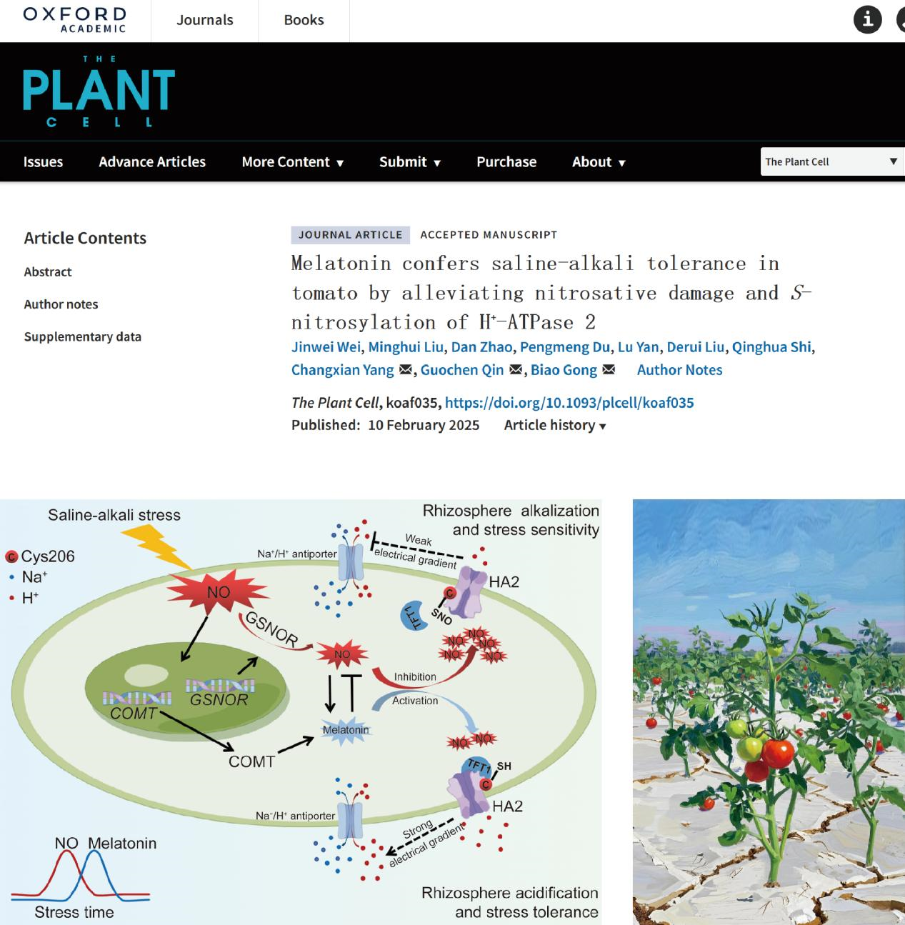 米乐mile体育官网园艺科学与工程学院巩彪教授团队联合北京大学现代农业研究院秦国臣研究员和杨长宪研究员团队协同攻关,发现褪黑素能清除盐碱胁迫下番茄根系产生的过量一氧化氮(NO),在蛋白质组层面降低亚硝基化修饰水平,本研究靶向耐盐碱关键蛋白质膜H+-ATPase2(HA2),进一步揭示了褪黑素通过降低盐碱胁迫下HA2的亚硝基化修饰增强其生理功能的分子机制,研究结果不仅阐明了番茄通过褪黑素减轻盐碱胁迫下细胞硝化损伤及维持HA2功能的分子机理,还拓展了褪黑素在植物氧化还领域中新的功能和信号转导调控途径,该成果发表在学术期刊The Plant Cell杂志上。