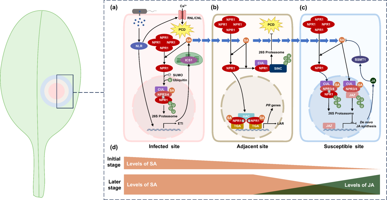 ETI过程中细胞死亡扩散和限制的机制是植物免疫领域的重要科学问题。文章总结了ETI反应中的水杨酸(SA)、茉莉酸(JA)和Ca2+等信号分子的作用机制,提出了一个包含感染区域、邻近区域和易感区域的三层“同心圆”模型,描述了ETI反应期间信号分子对细胞死亡扩散和限制的时空调节。在“感染区域”,NLR识别效应子并触发ETI,促进Ca2+流入和水杨酸合成。其中,Ca2+流入会引发程序性细胞死亡;累积的水杨酸会促进NPR1的核易位,并与NPR3/4结合形成NPR3/4-CRL3复合物降解NPR1,解除NPR1对细胞死亡的抑制。在“邻近区域”,高水平SA在此积累,诱导核NPR1活化,导致局部获得性抗性(LAR)相关基因转录和细胞质凝集物(cSINC)的形成,从而降解参与细胞死亡的蛋白质,促进细胞存活。在“易感区域”,转运而来的低水平SA通过NPR3/4-CRL3复合物介导JA转录抑制因子JAZ的降解,导致JA在该区域的合成。JA的积累会激活SA代谢基因BSMT1来拮抗SA,从而维持该部位的易感性。